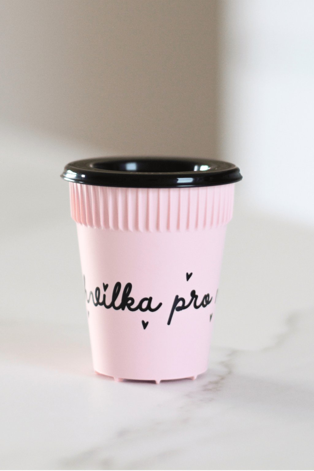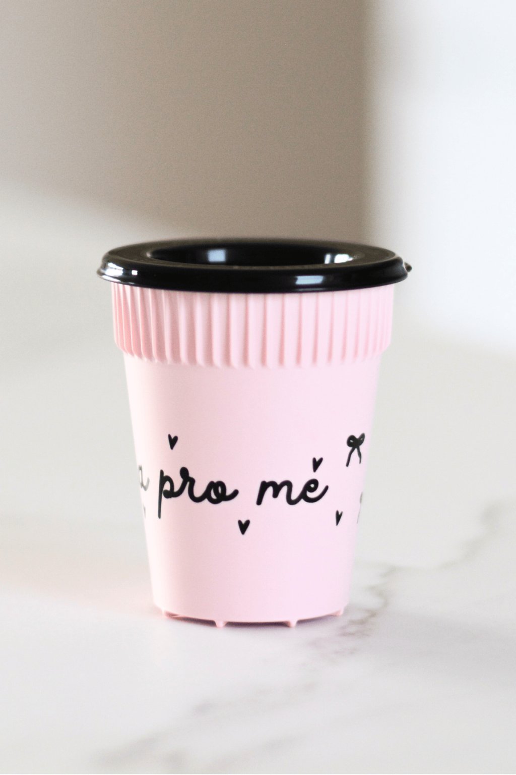 Kelímek Chvilka pro mě 100 ml je malý opakovaně použitelný kelímek s jemným nápisem doplněným ilustracemi mašliček. Růžový kelímek s černým víčkem bez pítka je zcela uzavíratelný a ideální na espresso, malý nápoj nebo drobné pochutiny do práce. Kombinace textu a ilustrací dává kelímku hravou, ale klidnou atmosféru, která připomíná, že i krátká pauza má smysl. Více informací dole v popisku.