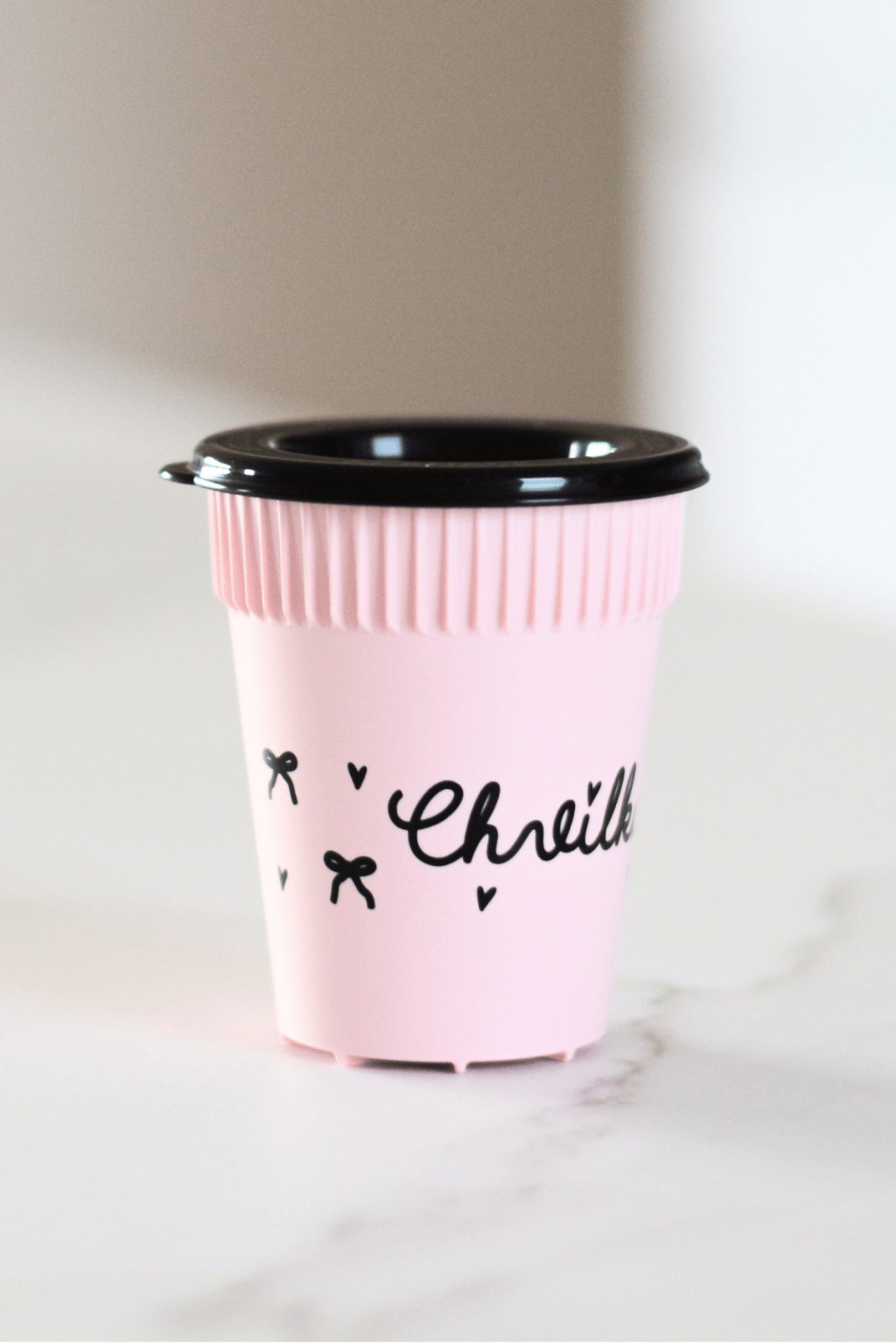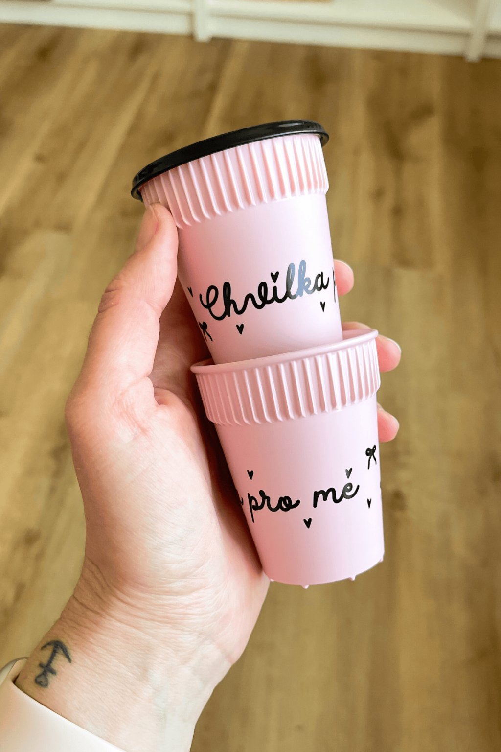 Barva: Růžový kelímek s nápisem a ilustracemi mašliček, černé zcela uzavíratelné víčko