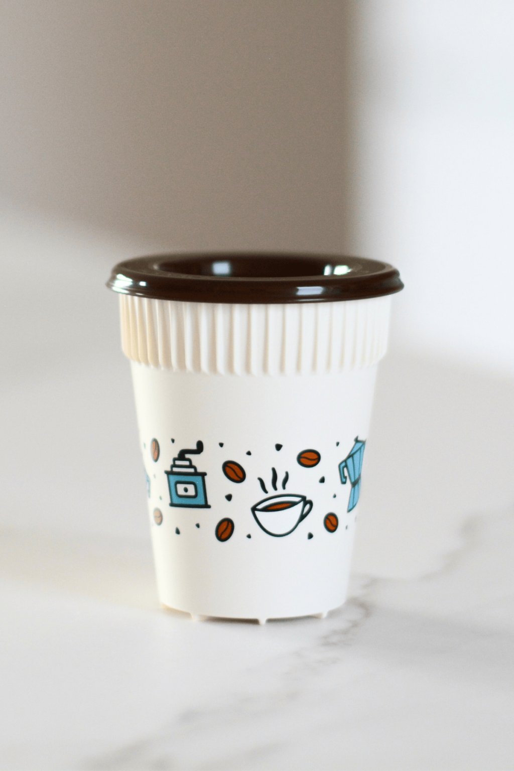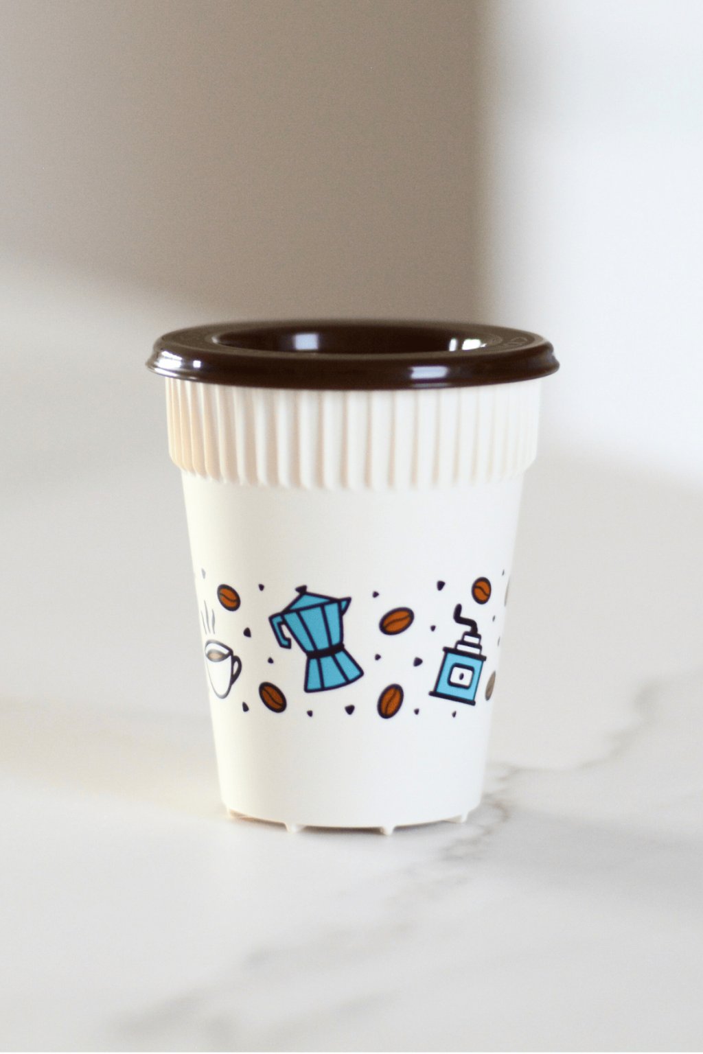 Barva: béžový kelímek s motivy kávy, hnědé zcela uzavíratelné víčko