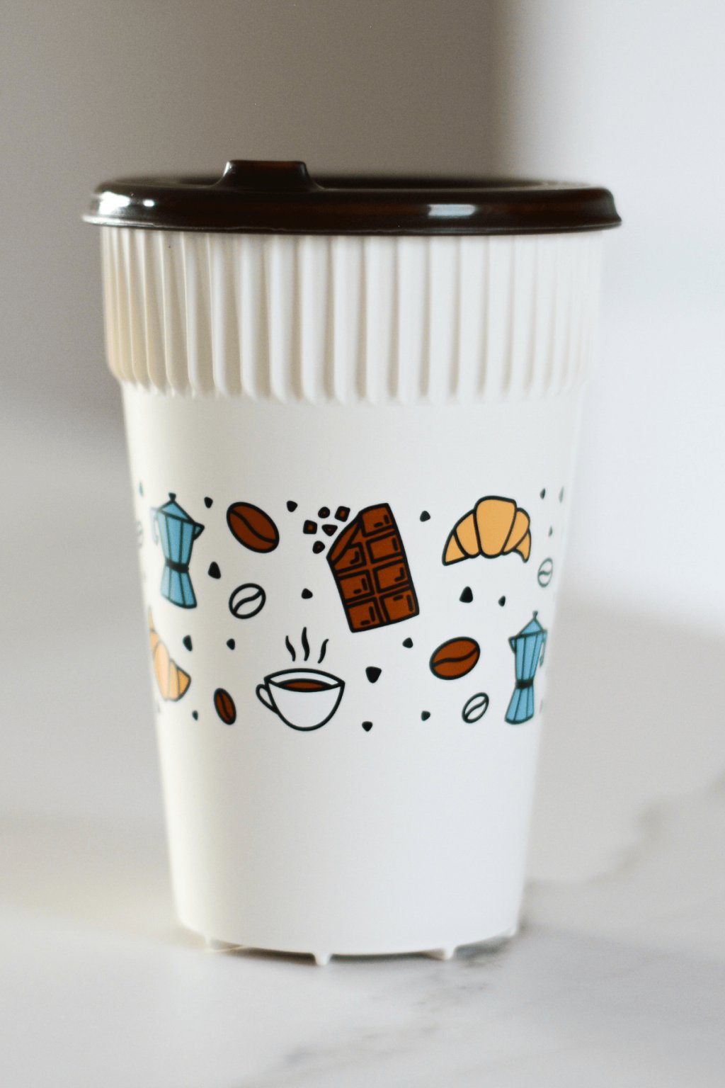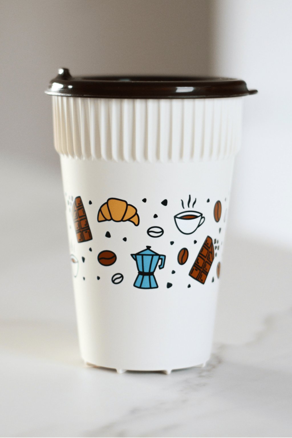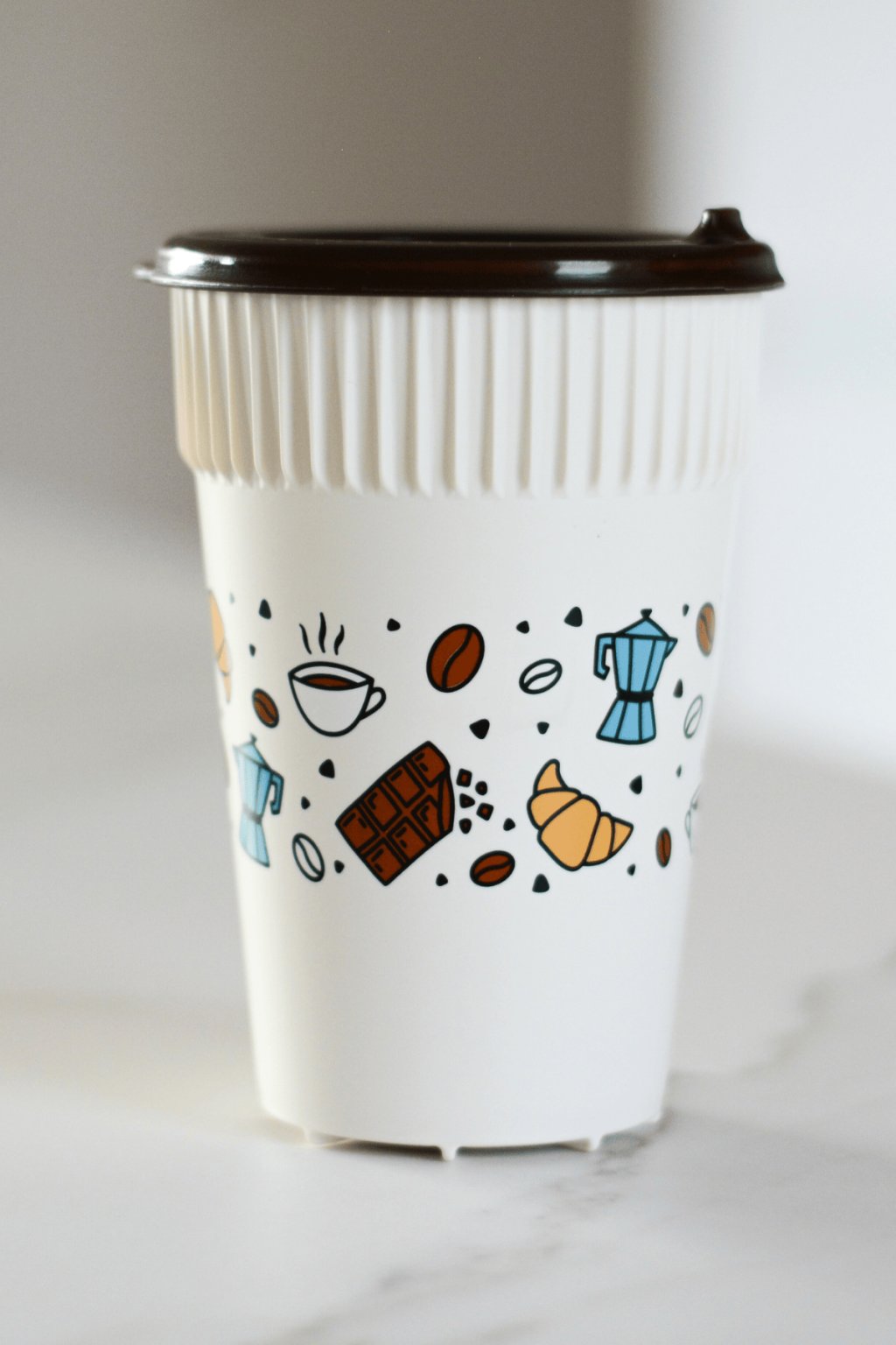 Barva: Béžový kelímek s kávovými ilustracemi, hnědé víčko s pítkem