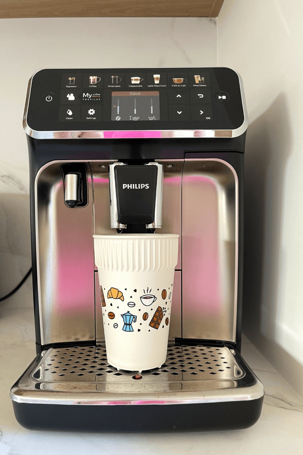 Kelímek Kávový moment o objemu 400 ml vznikl pro všechny, kdo vnímají kávu jako víc než jen nápoj. Je to chvíle klidu, zastavení a radosti – a přesně tenhle pocit přenášejí i ručně kreslené ilustrace, které jsou základem celého designu.