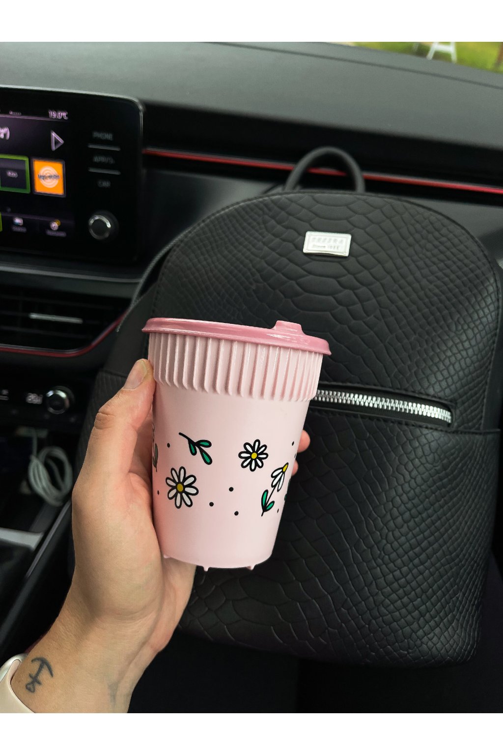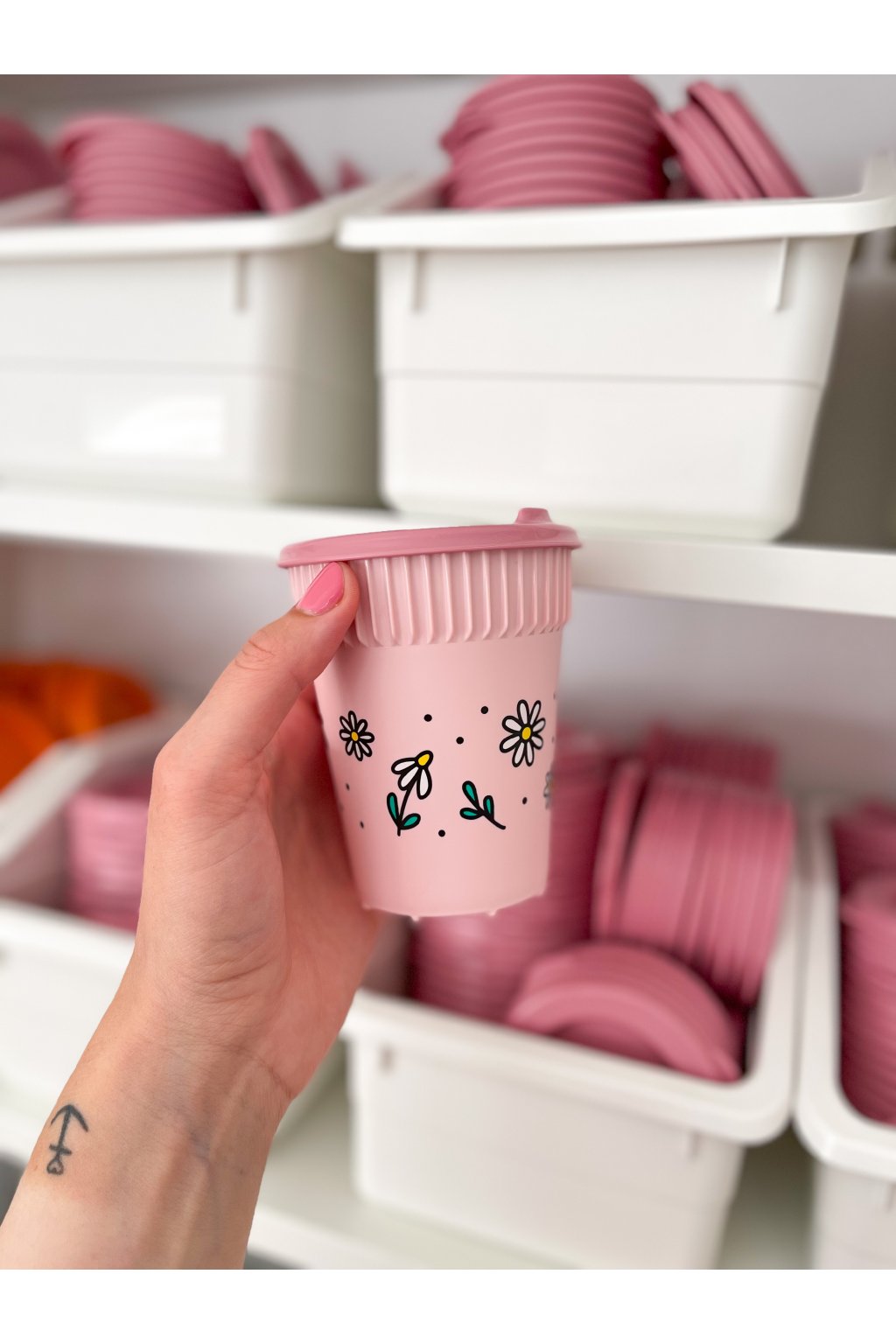 Barva: růžový kelímek s barevným motivem kopretin, růžové víčko