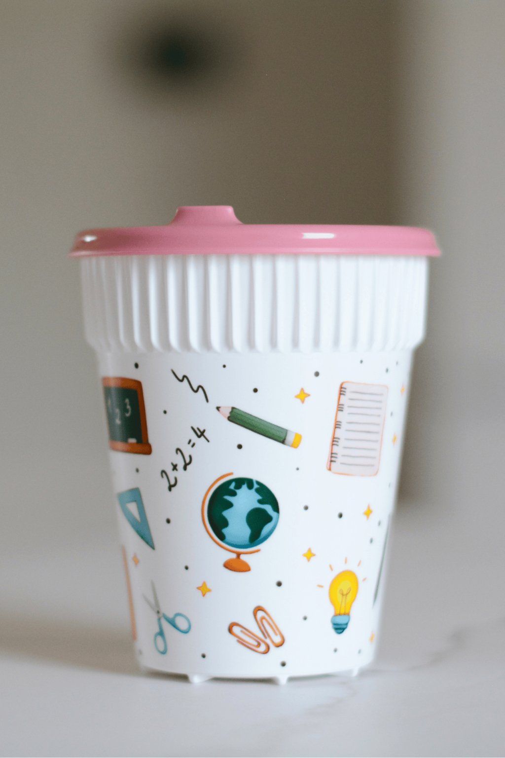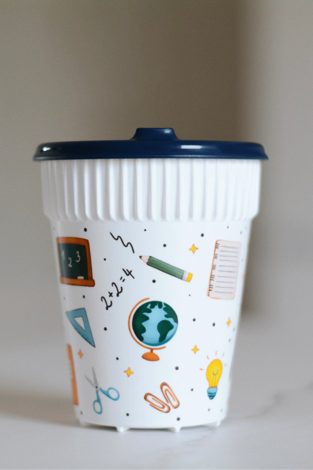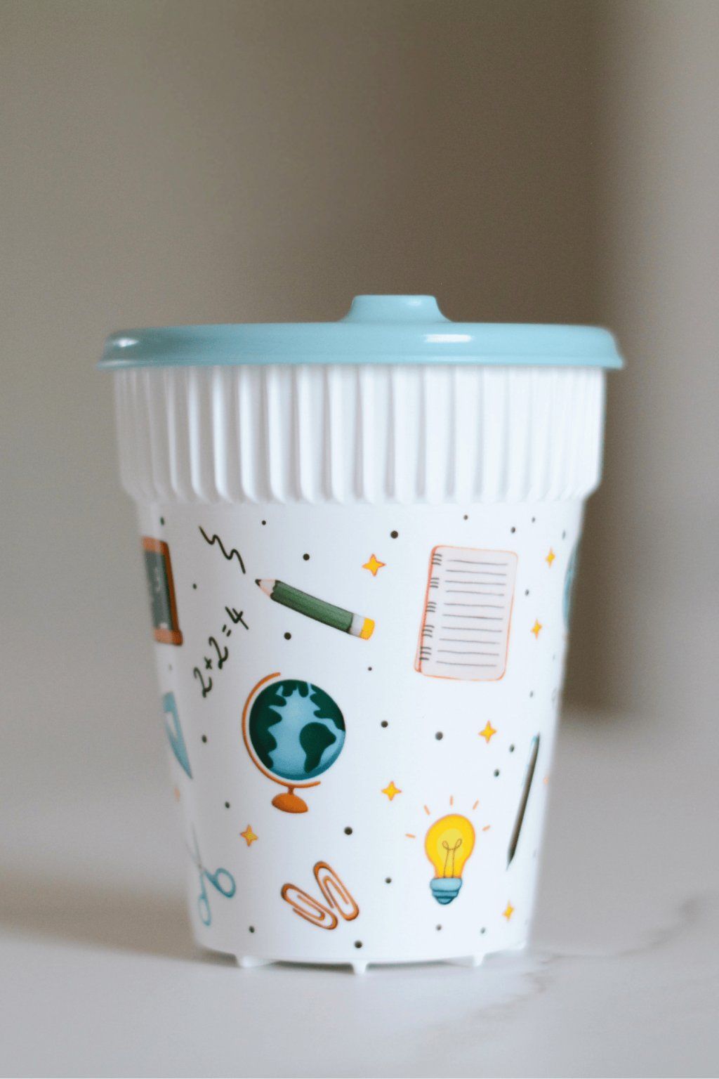 Tyto drobné ilustrace připomínají atmosféru školy, objevování a radosti z učení. Právě díky nim působí kelímek mile, hravě a zároveň nadčasově.