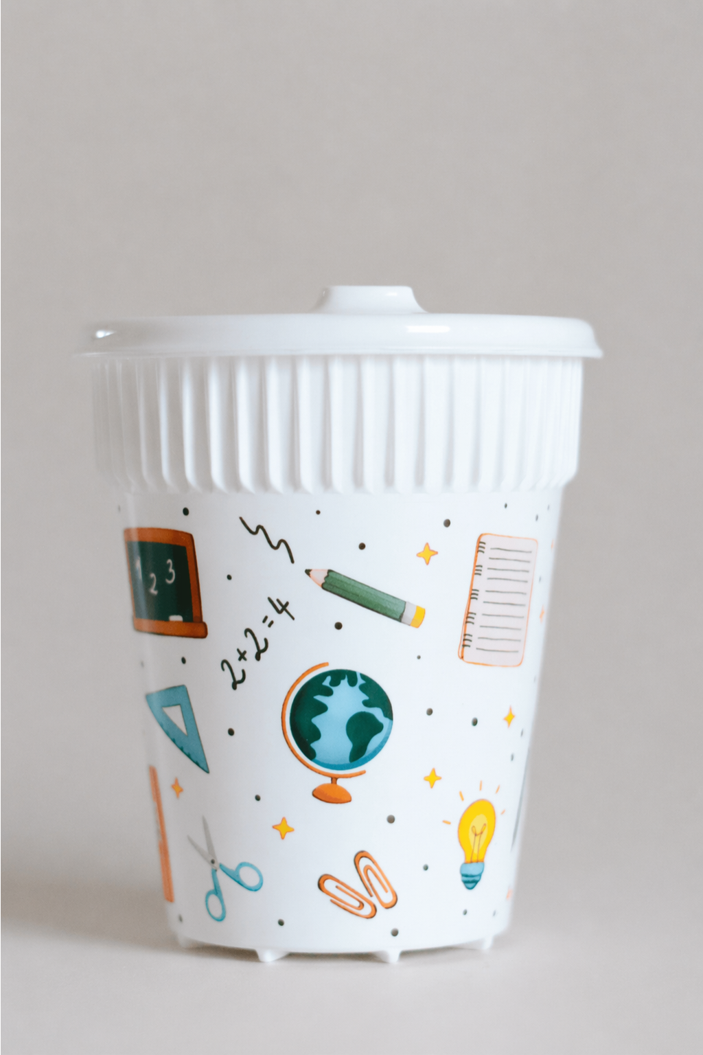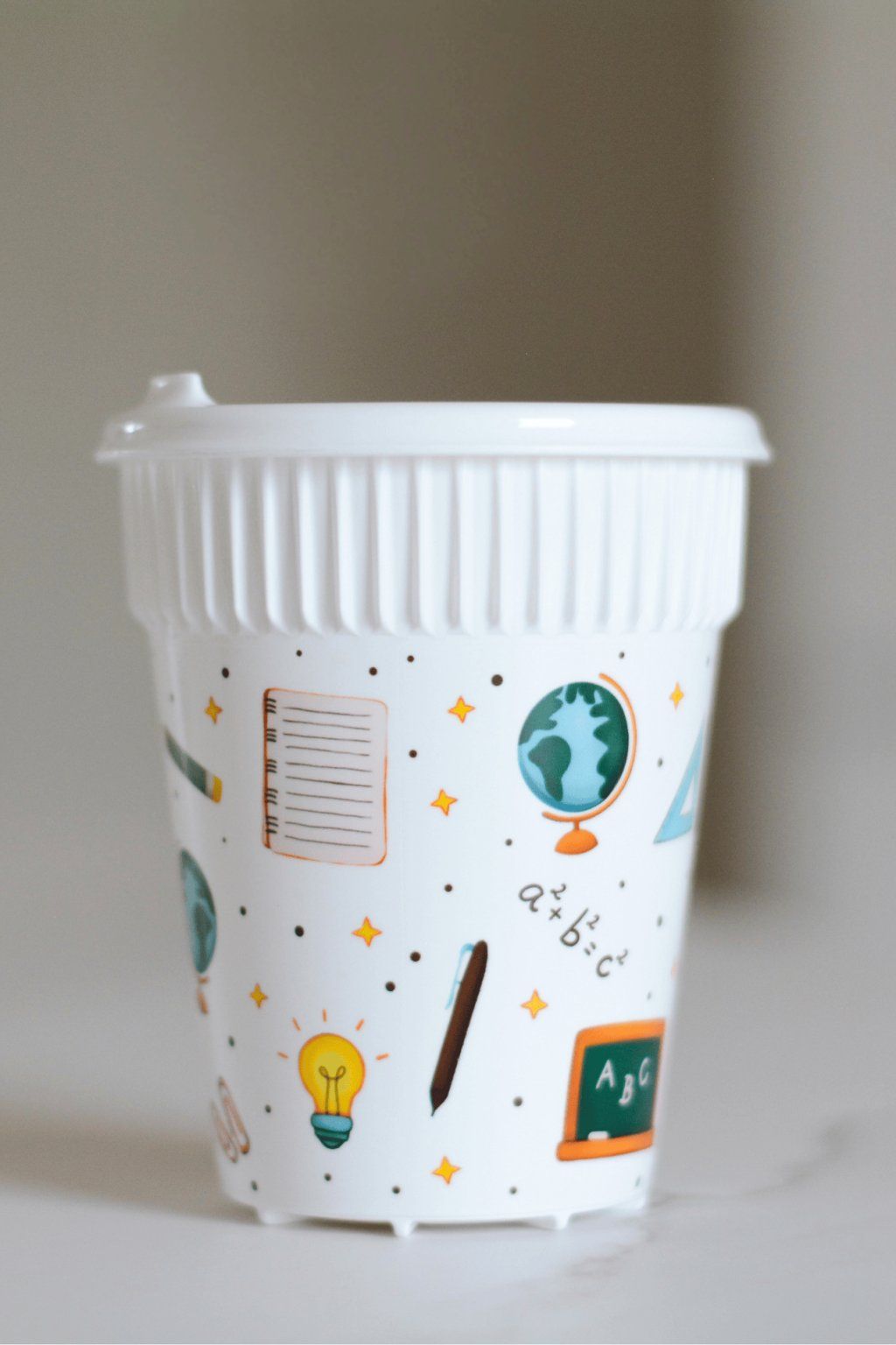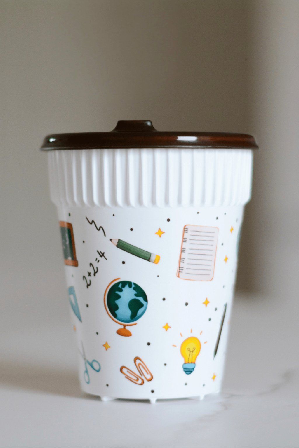 Tyto drobné ilustrace připomínají atmosféru školy, objevování a radosti z učení. Právě díky nim působí kelímek mile, hravě a zároveň nadčasově.