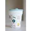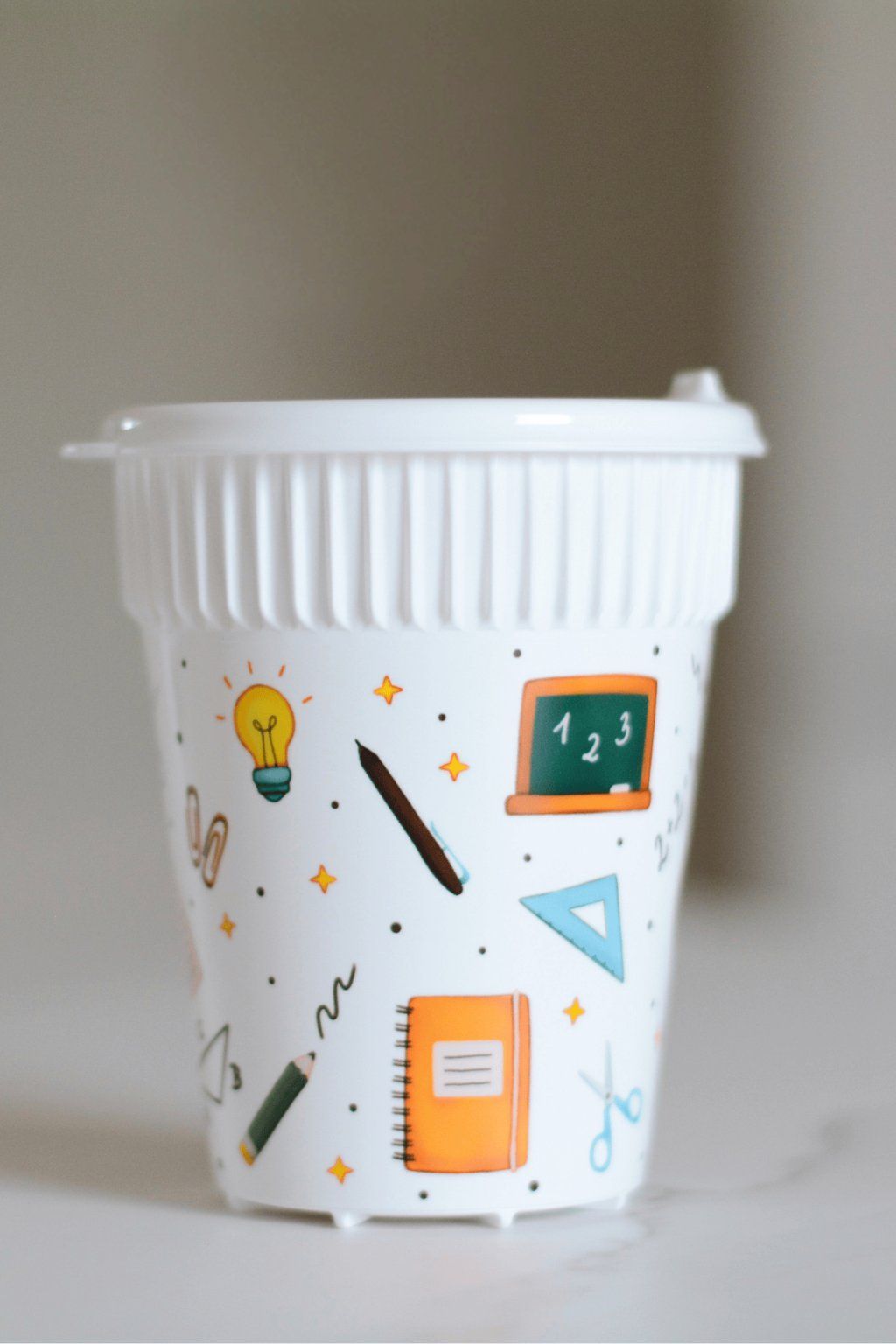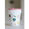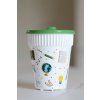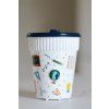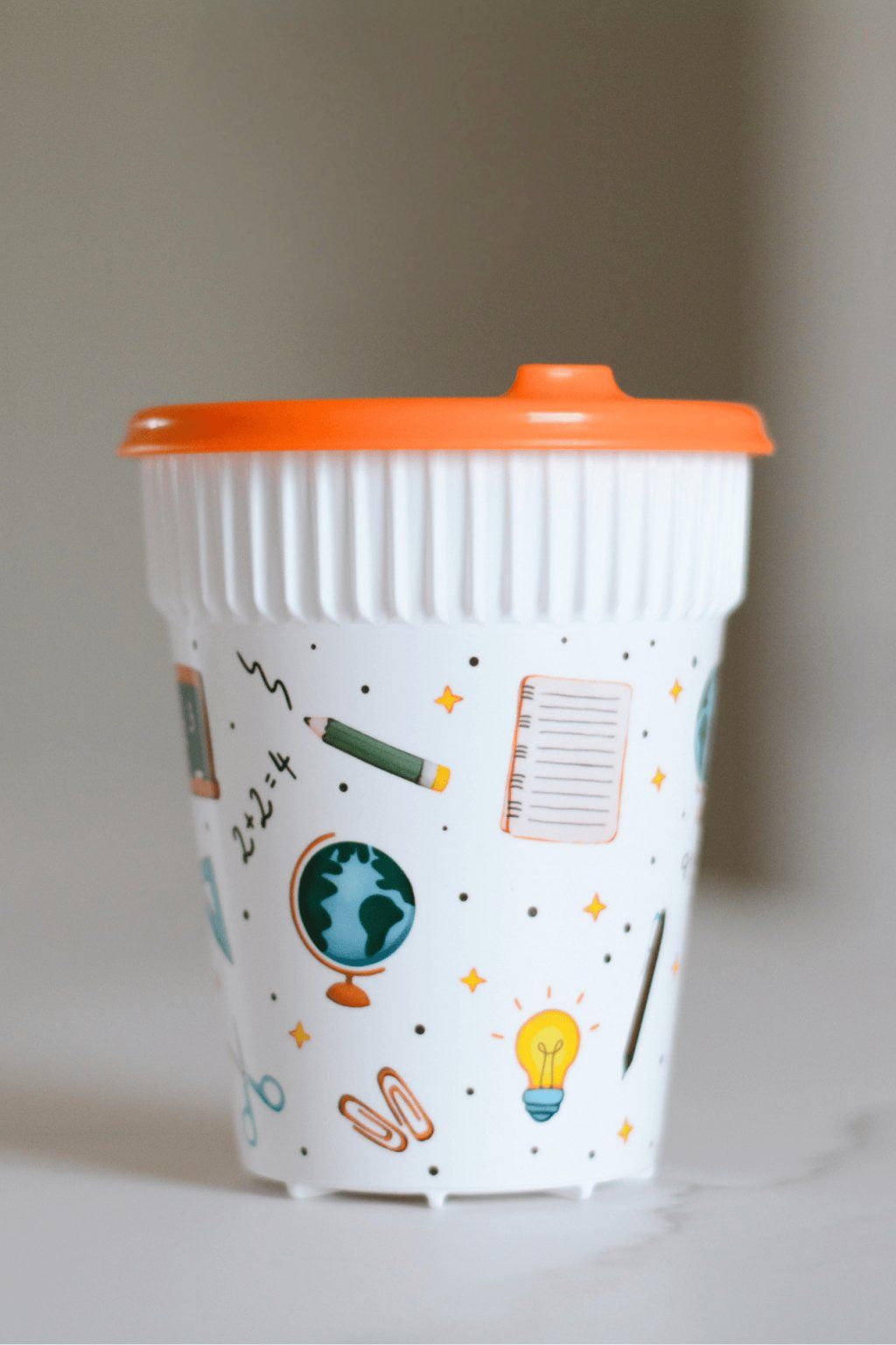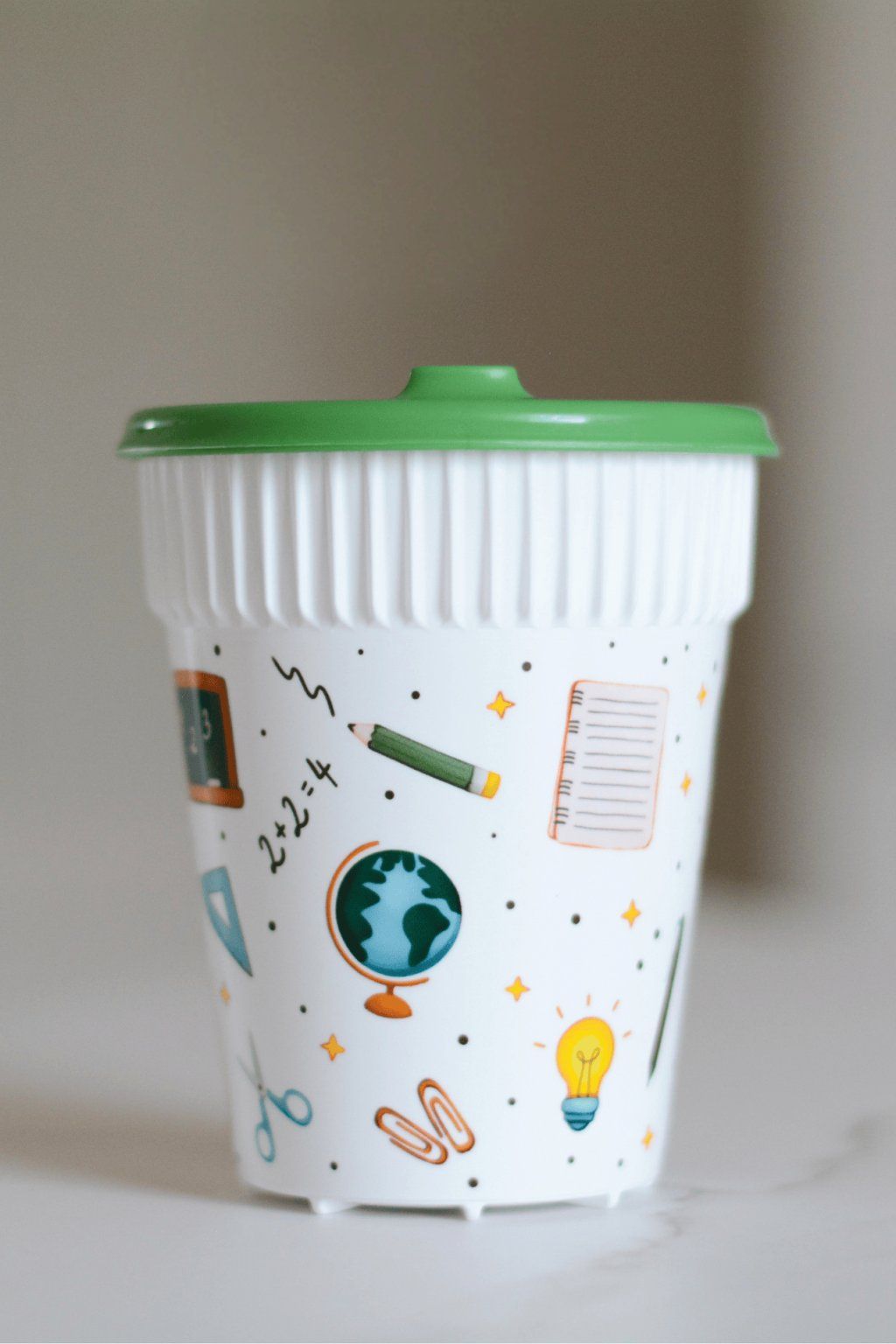 Barva: Bílý kelímek se školními ilustracemi, víčko ve více barevných variantách